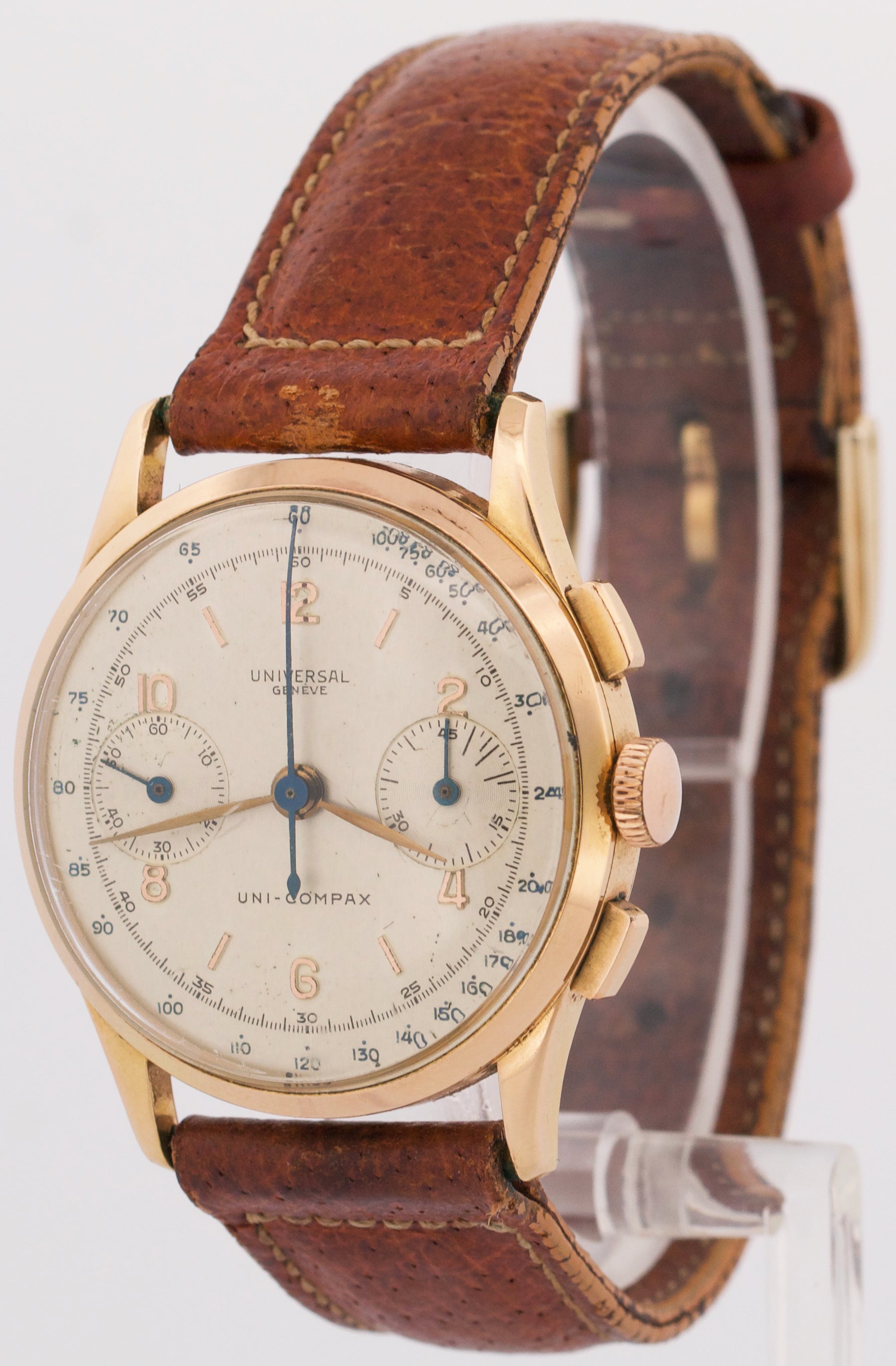 VINTAGE Universal Uni-Compax SILVER 35mm 18K Rose Gold Leather Manual 12445